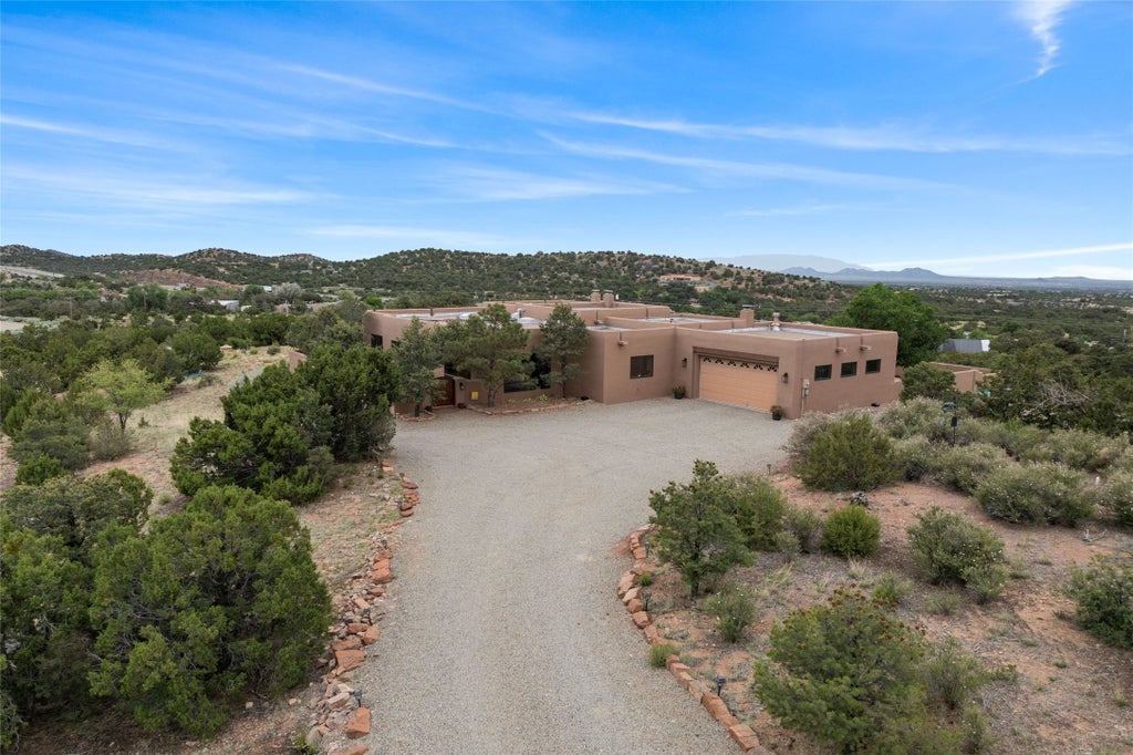 “Offering peace, privacy, and mountain views in every direction, 17 Sueño de Santa Fe is tucked away just minutes from downtown Santa Fe. This 5-acre property is ideally positioned to capture views of Sandia Mountain, the Sangre de Cristo sunrises, the Jemez Mountain sunsets, with convenient access to local favorites like El Gancho Fitness Swim & Racquet Club, Thrive Community School, and Harry’s Roadhouse. Built in 2006, the 4-bedroom, 2.5-bath home features a flowing floor plan designed for both comfortable daily living and easy entertaining. Multiple west-facing sliding glass doors connect the interior living spaces to the backyard and covered portal, creating a seamless indoor-outdoor lifestyle. The recently remodeled kitchen opens to a spacious family room with a kiva fireplace. Additional highlights include a formal dining room, a separate living room with its own kiva fireplace, and refined finishes such as diamond plaster walls and travertine tile floors. The primary suite is a peaceful retreat with its own kiva fireplace, a generous walk-in closet, and a luxurious en-suite bath with a soaking tub. Outside, the recently redesigned backyard provides the perfect setting for entertaining, relaxing while enjoying the natural surroundings, or star gazing from the hot tub. With beautiful earth-toned stucco and modern mini-split systems for efficient year-round comfort, this home blends timeless Santa Fe style with thoughtful updates. Peaceful yet connected, it’s an exceptional opportunity to enjoy a rare combination of privacy, natural beauty, and the Santa Fe lifestyle in one of the area’s most sought-after settings.”