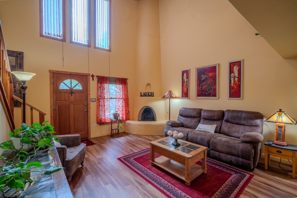 Live 8 years longer. Eat nuts, laugh out loud every day, and live in a house with stairs. A bedroom and bath on the ground floor and a master suite on the second floor including an office with a deck. The office could be converted to a bedroom if needed. Semi open floor plan, high ceilings and great outdoor spaces. Yardage, yes. This yard is big enough for your pets, your play, and your garden. Currently xeri-scaped there is all kinds of room for your plantings. Located in a desirable gated neighborhood with parks and trails, the location is an easy commute to Los Alamos, Albuquerque and just minutes to downtown Santa Fe. Call soon. This is a great value.