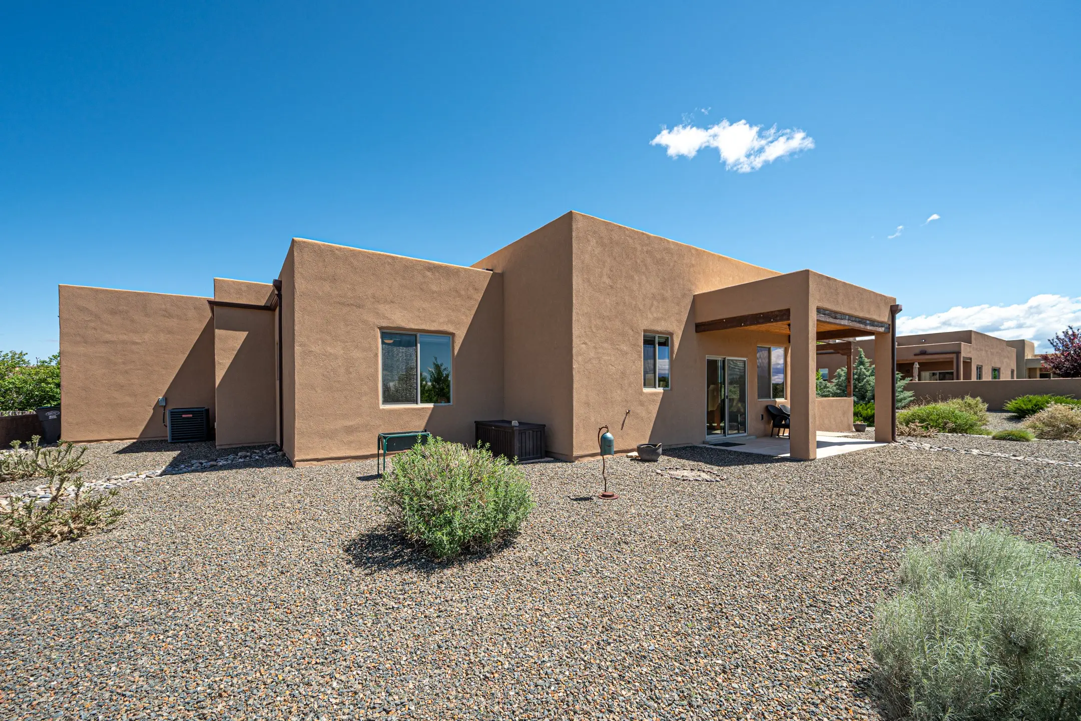 This thoughtfully designed three-bedroom, two-bathroom home offers space, comfort, and elegance in a peaceful neighborhood that is both easy to live in and commute from. The single-level home spans +/- 2000 square feet and includes a 200+ sqft attached studio (the converted third garage bay)—ideal as a fourth bedroom, office, or creative space. A bright living room with a cozy fireplace invites relaxation, while the modern kitchen features stainless steel appliances, stone counters, and ample space for cooking and entertaining. High ceilings, recessed lighting, and tile flooring enhance the open layout. The primary bedroom is complemented by an en-suite bathroom with double vanities, soaking tub with separate shower, and a generous walk-in closet. Two additional bedrooms provide flexibility for family or remote work. Located in the back of the development with views of green space and close to walking trails, your private outdoor space will feel limitless. Mature landscaping, the covered back portal and large side pergola combine to offer space for gatherings, gardening, or quiet moments. Other features include an attached 2-car garage, central AC and heat, and a roof with transferable warranty. Located near the Dinosaur Trail Trailhead and close to local supermarkets and healthcare, this home combines practical living with Santa Fe charm.
