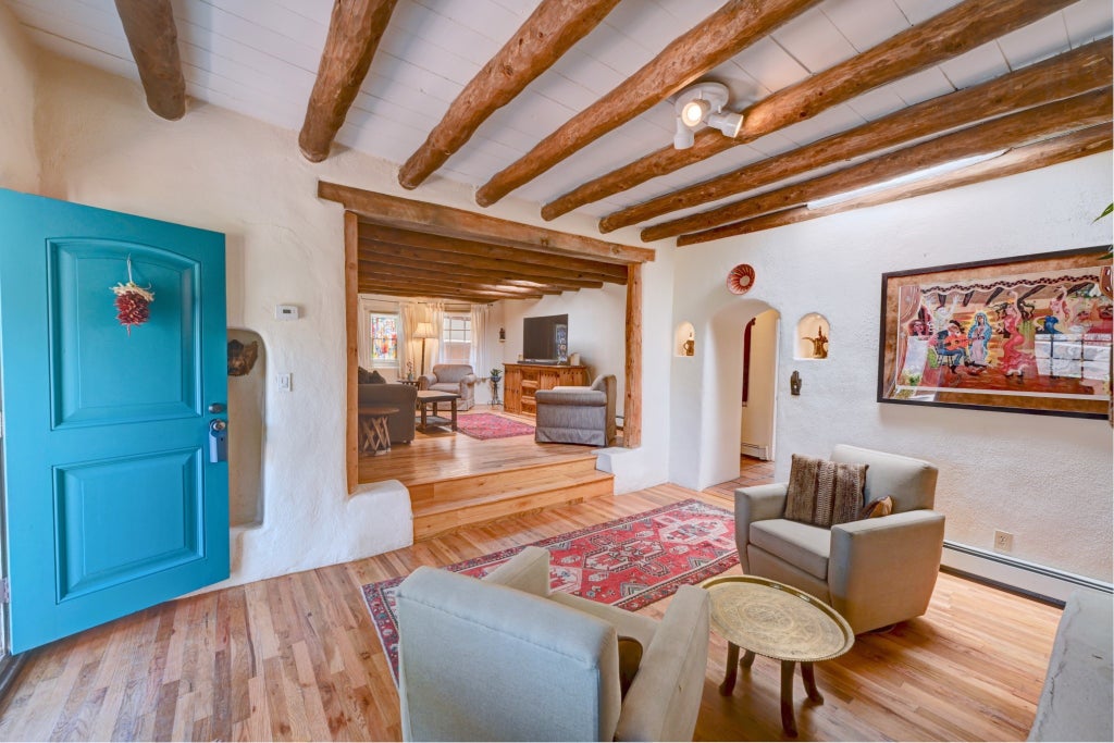 A hundred years of Santa Fe history is represented in this unique home. From the original small structure, built in the 1930’s with its thick adobe walls, subsequent owners have added numerous updates and additional living spaces while maintaining the history and character of the residence. These adobe walls and double-paned windows throughout the house, provide peace and quiet from the home’s location on the road leading to the renowned Santa Fe Ski Basin and to miles of hiking trails. The two-tiered living room features a fireplace and a designated area for activities such as reading, listening to music, and watching TV. The heart of the house is the central kitchen/dining area, where family and friends gather for meals and conversation. Cabinets, counters, backsplashes, and appliances have been updated to accommodate modern living, while the original floors, nichos, and ceilings have been carefully preserved. The traditional Kiva fireplace, once part of the original portal, serves as a focal point for the area. Well maintained and updated, it adds warmth and charm during Santa Fe’s brisk winters. The situation of two of the three bedrooms off the central area provides privacy for guests and residents alike. One has an ensuite bathroom while the other provides garden views. Down a sunny hall, also with garden views, is the primary bedroom and bath. With a Kiva fireplace and outdoor access, this suite is a serene retreat. Its location from the central living area guarantees spacious privacy for the main occupants while hosting family and friends. The two outside areas have been designed to address the specific requirements of Santa Fe’s climate. Water wise trees, shrubs and perennials support native pollinators while bringing edibles and color to the landscape. A water catchment system collects hundreds of gallons of water during the region’s infrequent rains for use during the dry season. To top it off, this gem boasts a new TPO roof, new exterior stucco, two tankless hot water heaters (2020); solar panels (2021); and five minisplits (beginning 2018) making it move-in ready. This is a home not to be missed! Do not miss the 3-D Matterport walkthrough and drone footage in the listing!