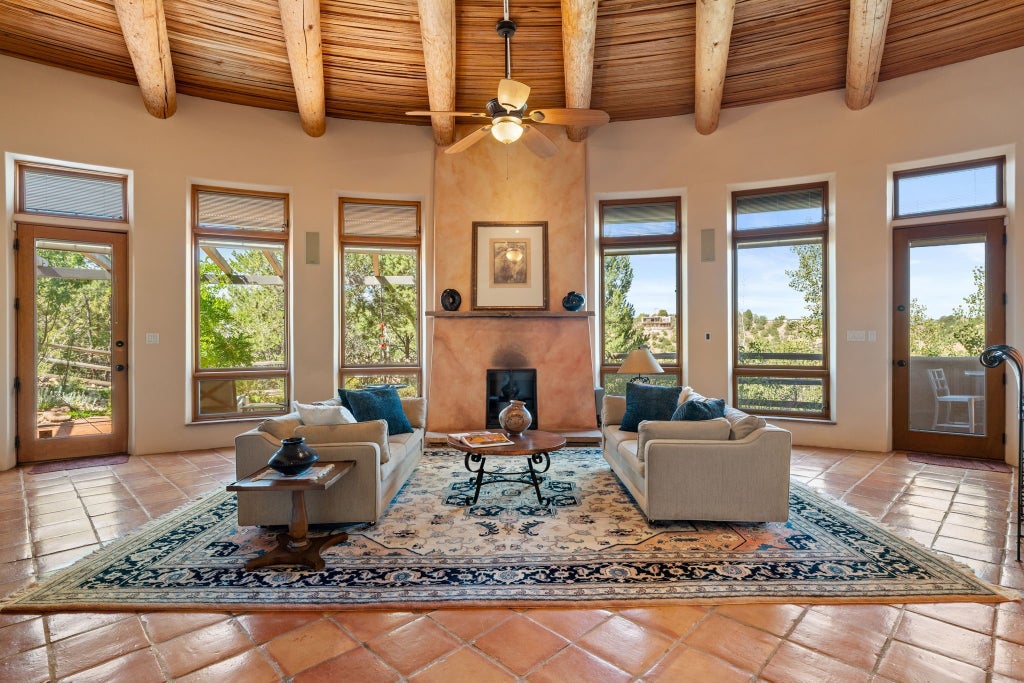 Perched high on a serene hilltop with commanding views of the Sangre de Cristo Mountains, this Santa Fe-style custom estate offers a masterful blend of artistry, comfort, and Southwestern soul. Just minutes from the historic Plaza yet nestled in a private enclave on a full acre, this 4,300-square-foot sanctuary embodies the magic of Northern New Mexico living. Step inside to sun-drenched interiors where massive windows frame mountain vistas. The dining room, with stenciled beams and a corner Kiva fireplace, is perfect for cozy evenings or elegant entertaining. The living room impresses with fan-shaped vigas, a dramatic fireplace, and custom mantle, flowing into a spacious kitchen with granite counters, island, gas stove, copper hood, skylights, and walk-in pantry. Two luxurious Primary Suites ensure privacy. The main-level suite includes a coved ceiling, updated bath, private den, and French doors to a tranquil patio. Upstairs, a curved staircase leads to the second suite with Kiva fireplace, private deck, and bridge walkway to a spectacular 75-foot lap pool. Perfect for gatherings, the entertainment room — once home to two grand pianos — opens to the front portal. A charming casita above the two-car garage adds versatility with sleeping space for five, full bath, closet, kitchenette, private patio, and separate entrance. Blending Santa Fe craftsmanship, modern updates, and breathtaking surroundings, this home is more than a residence — it is a living work of art and a rare opportunity to own a piece of Santa Fe’s soul.