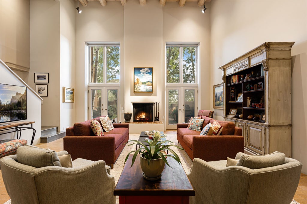 Desirable Los Miradores 3-bedroom, 3-bath residence close to Museum Hill and Canyon Road. Living room with soaring beamed ceilings and stately fireplace framed by high windows that highlight the towering trees outside. Updated kitchen, equipped with high-end appliances including a double oven, Sub-Zero refrigerator, wine fridge, and elegant quartz countertops, along with a center island perfect for casual dining and entertaining. This home features two spacious bedrooms and bathrooms on the first floor, providing convenience and comfort. Upstairs, you'll find a den/office area and a generous bedroom complete with a kiva fireplace and a large bath, both with access to outdoor decks that enhance the living space. All baths have been recently remodeled. The delightful, landscaped backyard combines a flagstone patio, outdoor fireplace, and serene nature paths bedecked with aspen trees and a tranquil fountain. 2-car attached garage. The gated community of Los Miradores offers many amenities, including a seasonal pool, workout facility and tennis court. Additionally, a 2-bedroom casita owned by Los Miradores offers rental opportunities for guests.
