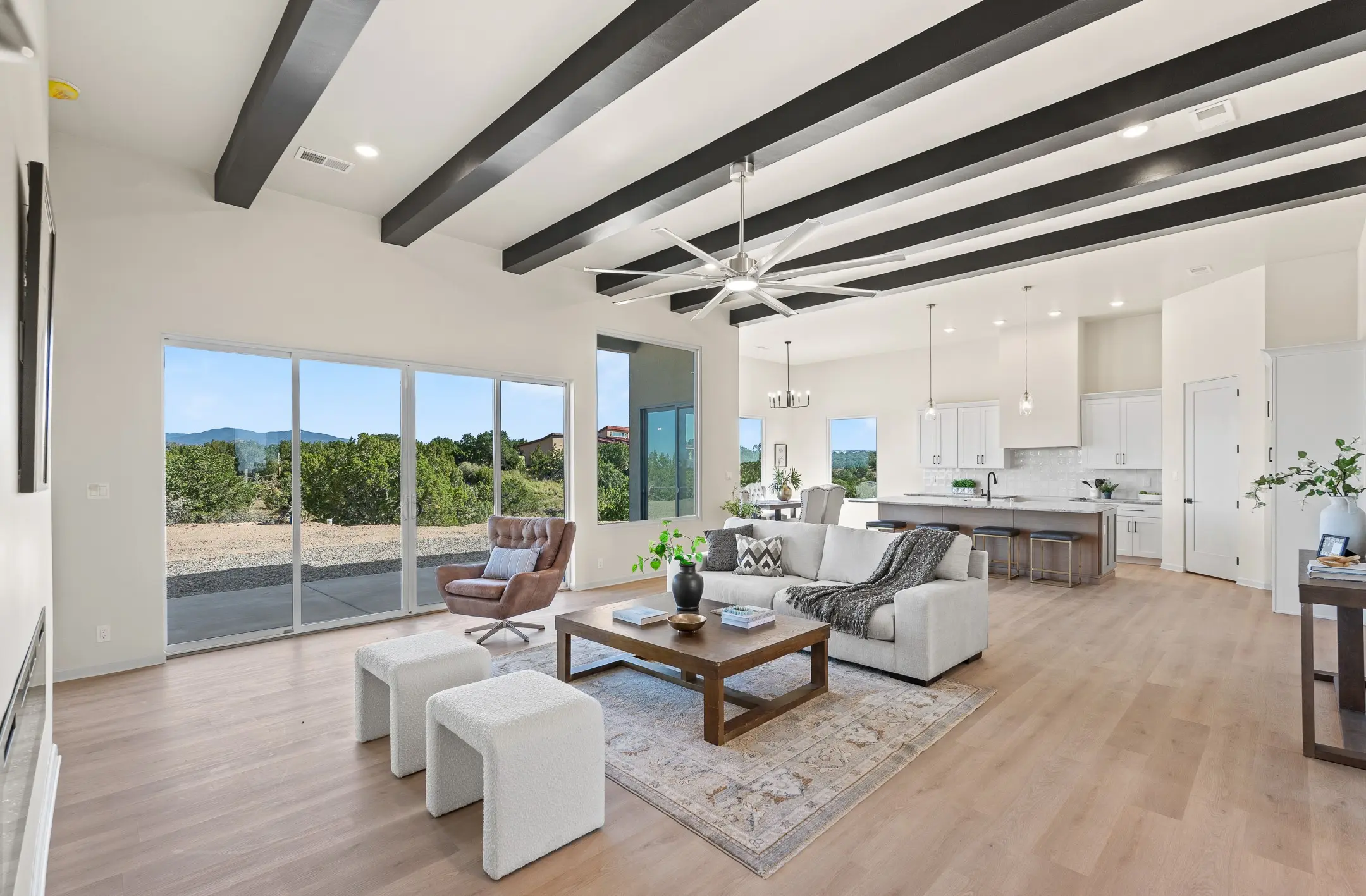 Fabulous view from the moment you walk in the front door from the wall of windows that take your eyes to the views all the way the snow capped Sangre de Cristos. The huge picture window in the primary bedroom wakes you up with views of the Santa Fe ski basin. Just completed and ready for occupancy! Mountain views from every window in this new custom built contemporary pueblo style home with open floor plan situated on a huge 10.0 +/- ac. private lot in Lamy. Convenient access to US-285, the Agora shopping center, bank and restaurants. Perfect for indoor and outdoor entertaining. Open kitchen/family/dining room has floor to ceiling windows and double sliding glass doors to take in the fabulous views and access to the portal. The contemporary kitchen has a huge island bar and large walk in pantry. Every room has large picture windows with fabulous mountain views. Owner's bath has double sinks, soaking tub and large walk in shower room with double shower heads and rain showers and a large walk in closet. Home features contemporary style vigas in living areas. Three bedrooms with good separation and 2 baths. A guest house and equestrian structures are allowed, as well as 10 horses or cattle. (1 large animal per acre.) No HOA, recreational vehicles are allowed if parked inconspicuously. Connected to the Eldorado community water system. Located only 20 minutes from Downtown Santa Fe this home offers gorgeous views, rural living and easy access to everything Santa Fe has to offer. This home has it all; new home, fabulous views, great outdoor spaces, contemporary open floor plan, large private lot. Buyer to verify all information and Covenants. Seller gives $4000 credit to the buyer at closing for Range, dishwasher and microwave.