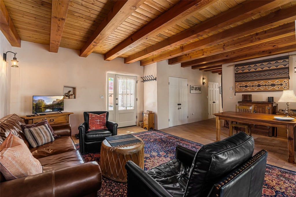 In the heart of South Capitol lies a 150-year-old double-adobe home, lovingly and completely remodeled in 2020 to preserve its historic soul while embracing modern living. This contributing historic property offers two inviting living spaces and a newly designed primary en suite, seamlessly blending old-world craftsmanship with today’s comforts. With 3 bedrooms, 2.5 baths, and 2,560 sf (including a separate studio), the home features radiant floor heating, forced-air HVAC, and air conditioning in select rooms. Thick adobe walls ensure natural comfort year-round. Outside, discover two private patios, a mature apricot tree, grapes, and landscaping in three distinct zones, all framed by custom gates and latilla fencing. A large gated parking court adds ease and security. The property also includes a private well (currently inoperable but valuable for future restoration). Just a short walk to the Plaza and located within the coveted Wood Gormley Elementary School district—consistently ranked #1 in Santa Fe—this home is both historic and enchanting, offering a lifestyle that is truly timeless.