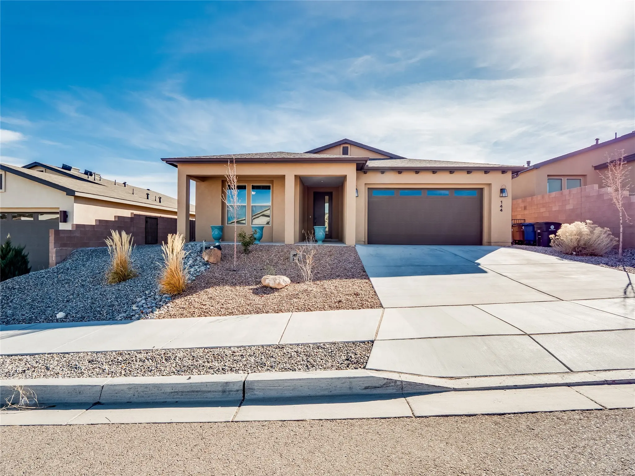 Gorgeous single level modern home blends clean design, natural light, and effortless livability in the desirable White Rock community. A low maintenance front yard invites you to a covered porch, creating welcoming curb appeal without the burden of upkeep. Step inside to a long, skylit foyer with durable tile flooring that flows through the main living areas. Natural light leads you into a bright, great room layout. The spacious living room easily accommodates a large sectional, perfect for movie nights and everyday comfort. Centered is a gas fireplace with decorative tile surround, framed by built-in cabinets for style and storage. The adjacent kitchen offers modern sophistication with warm, cohesive finishes. A large center island provides seating and workspace, highlighted by gold pendant lighting. Taupe cabinets with bronze hardware pair beautifully with a white tile backsplash, quartz counters, and stainless steel appliances. A sizable pantry enhances organization and convenience. The dining area features sliding doors that open to a covered patio and a fully fenced backyard designed for low-maintenance enjoyment. Complete with turf, trees, and mountain views, the space offers room for creativity, ideal for, planters, or personal design. Near the entry, two guest bedrooms with carpet share a Jack-and-Jill full bathroom for a smart, efficient layout. A secondary hallway hosts an additional guest bedroom and bathroom with single sink vanity and tiled walk-in shower with glass enclosure. This hall also includes a laundry room with sink and direct access to the two-car garage for added practicality. Tucked toward the back, the primary suite serves as a peaceful retreat with carpet flooring, expansive windows, and mountain views. The spa like ensuite features tile flooring, double-sink vanity, and a walk-in tiled shower with built-in bench. A custom-organized walk-in closet maximizes storage. Move-in ready and waiting for you to schedule your tour today!