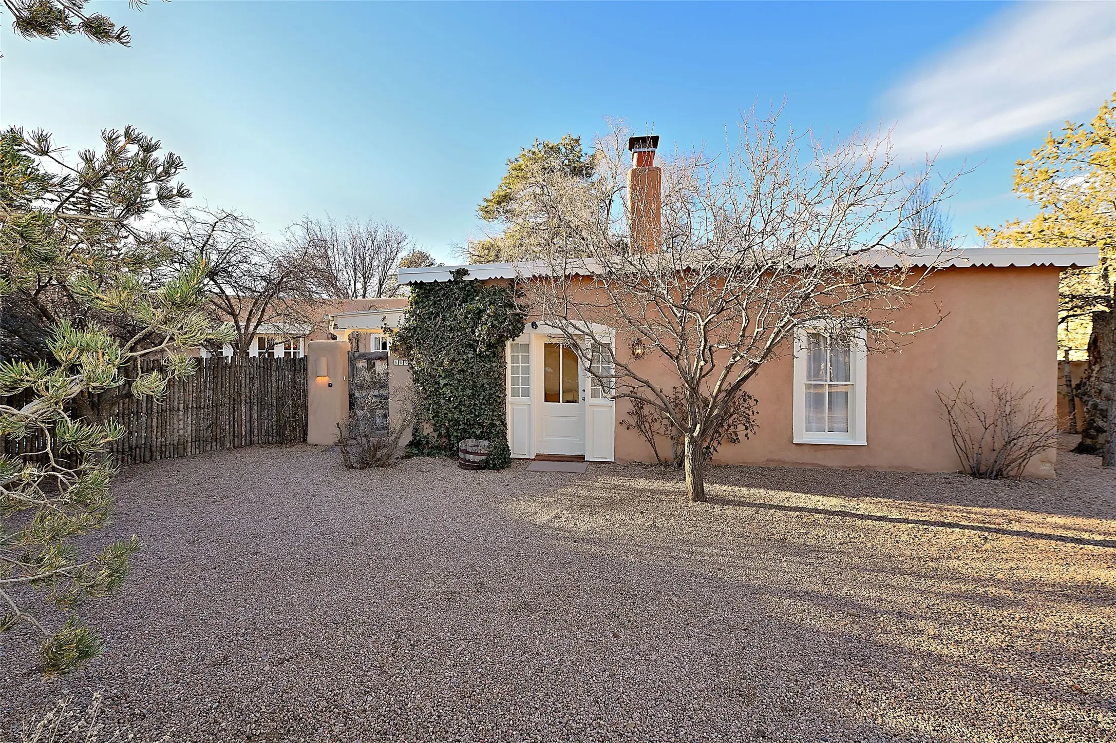 Tucked away on a quiet lane just off historic Canyon Road, this exceptional compound offers Santa Fe living at its best. This house was originally built in 1947 by artist Agnes Simms and thoughtfully expanded in 1997 by noted collector Omer Claiborne. The spacious main house welcomes you with a graceful, light filled living room featuring 12-foot beamed ceilings, multiple French doors, concrete floors, a fireplace, and extensive wall space ideal for displaying artwork. The beautifully designed kitchen opens seamlessly to an impressive dining room and includes a large walk-in pantry. There are four well separated bedrooms and five baths, and the home provides exceptional privacy and comfort. A serene east-facing courtyard extends the living space outdoors, creating a perfect setting for relaxing and dining. Mature plantings – including wisteria, lilacs, pear, plum and crabapple trees enhance the sense of tranquility. The charming guesthouse is accessed through its own courtyard and offers a cozy retreat complete with kiva fireplace, kitchenette, and bath. Located moments from Canyon Road’s renowned galleries and restaurants and within walking distance of the historic Plaza. This rare property represents the best of Santa Fe living.