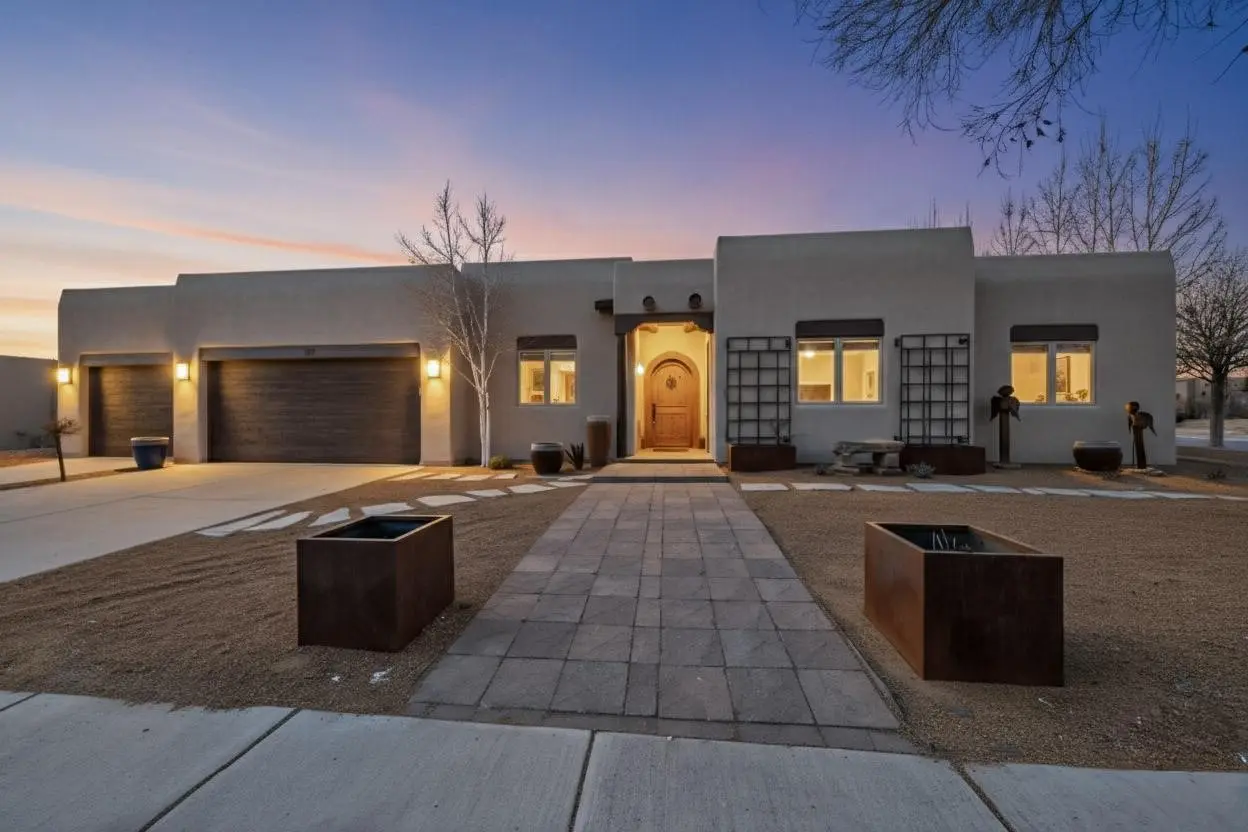 This stunning home in La Pradera is one of the few custom-built homes in the neighborhood with upgraded southwestern finishes. This open-concept gem features authentic vigas and a magnificent handcrafted river rock wood-burning fireplace. The exquisite custom cabinetry and doors are meticulously handcrafted by a local Santa Fe artisan. The chef's kitchen boasts stone countertops, a skylight, a gas stove, a new fridge, and double smart ovens. Year-round comfort is guaranteed with radiant floor heat, central heating/cooling, and upgraded electrical panels. The smart layout offers great primary/guest separation from the 3 additional bedrooms, one of which has a private exterior entrance, perfect for an office or flex space. The 2 full bathrooms and one ¾ bathroom perfectly serve the home. Premium Pella windows let in tons of natural light. Step outside to a private backyard surrounded by beautiful trees perfect for entertaining, with traditional coyote fencing, mature aspens, and a dog run. Included is a 3-car finished garage. The home sits on an extra-large corner lot, which offers additional parking for your guests and unbeatable access to trails, shopping, and I-25!